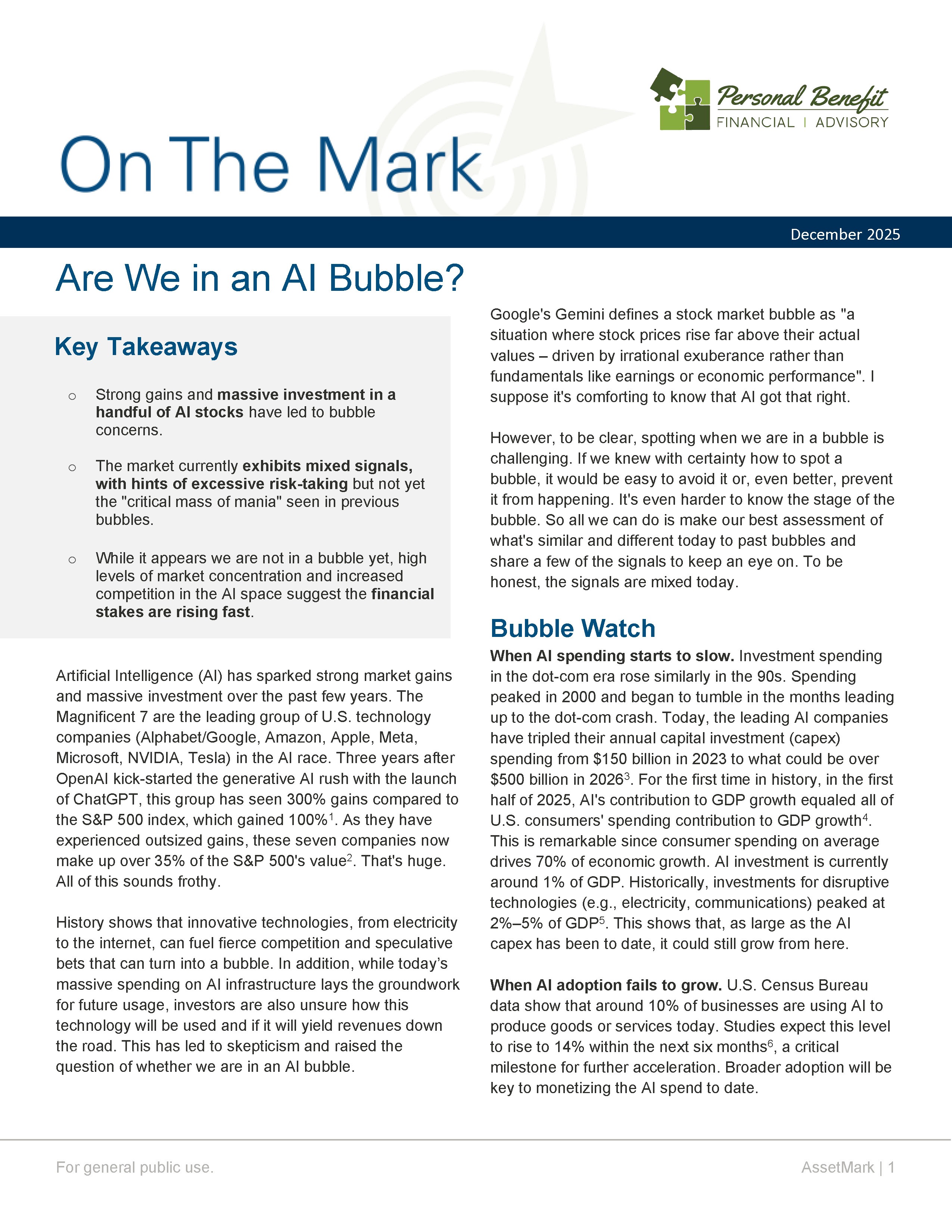 Today, we wanted to share an interesting article with you from AssetMark: On The Mark | Are We in an AI Bubble?.